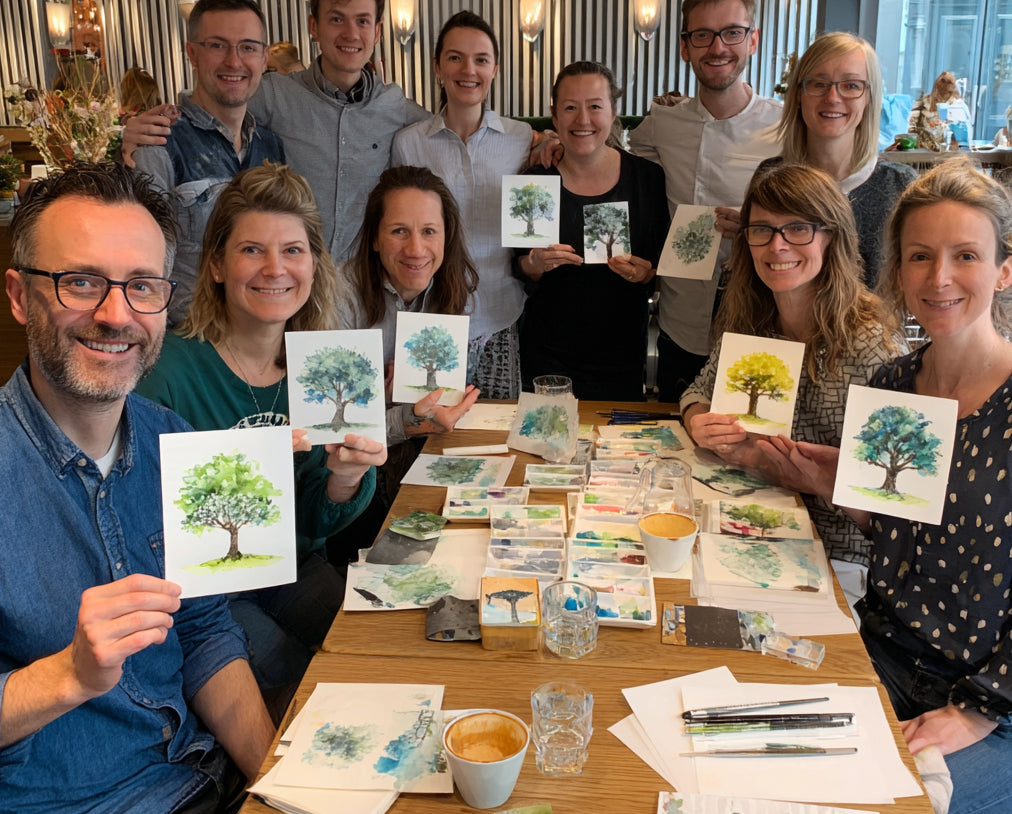 This relaxed, guided session helps colleagues connect, unwind, and try something new. I provide all the materials and clear, step‑by‑step help, so everyone leaves with a finished watercolour they’re proud of.